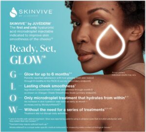 SKINVIVE by JUVÉDERM® is a modified hyaluronic acid gel that works beneath the surface of the skin to improve cheek smoothness and hydration. It’s the first and only HA microdroplet injectable approved to increase skin hydration, resulting in a lasting glow and smoother texture. Patients report visibly healthier, hydrated, and refreshed-looking skin — no matter their skin type or tone.